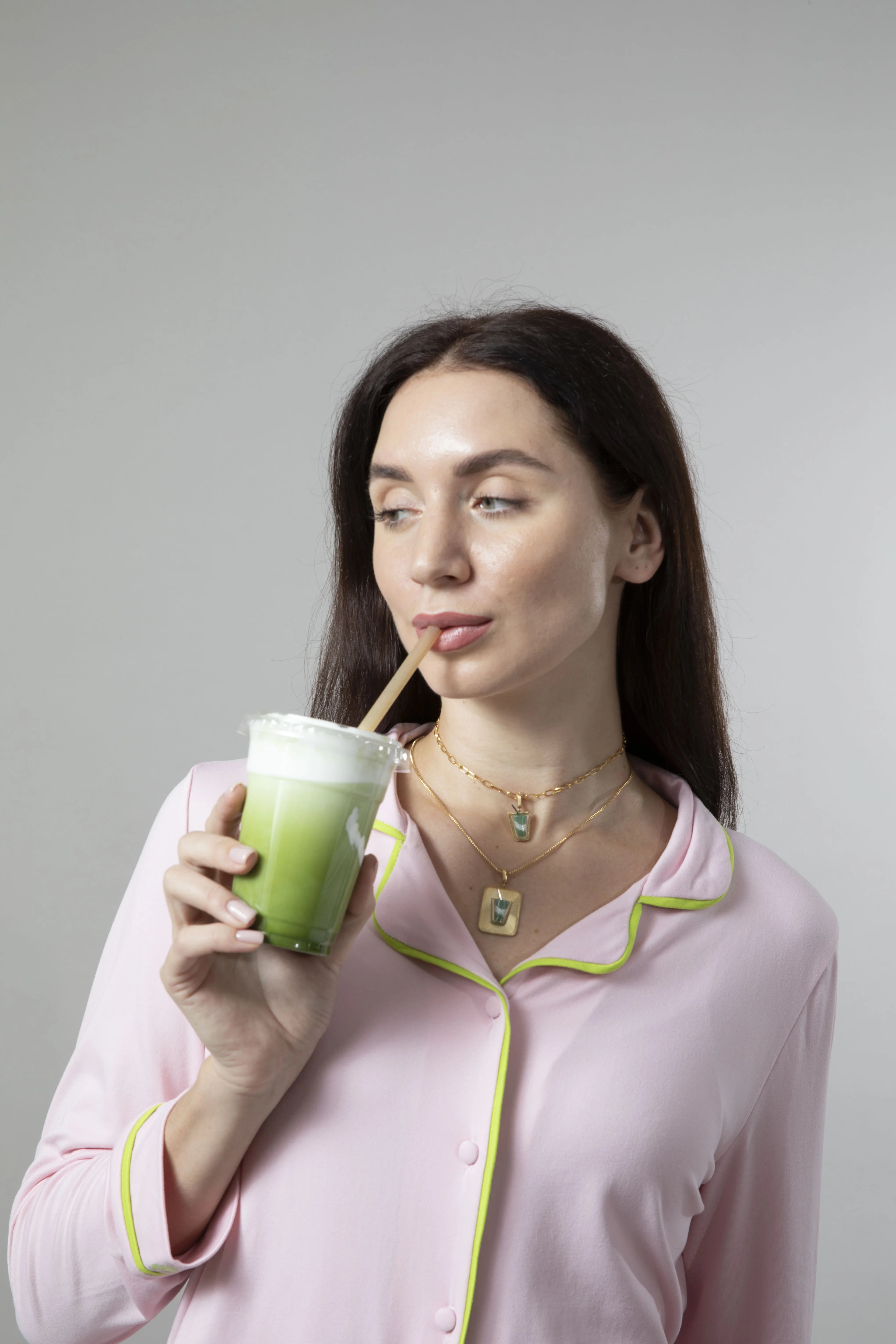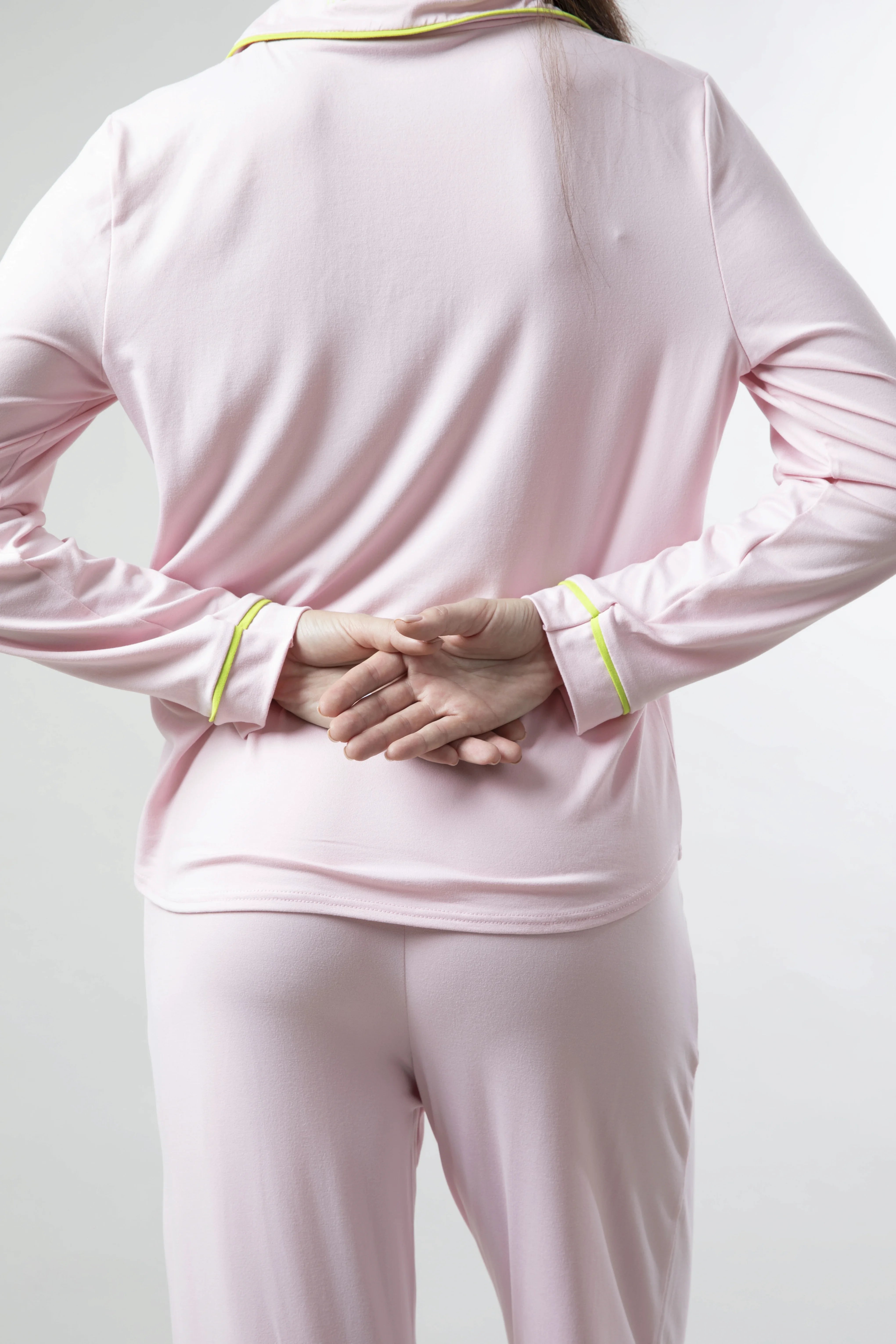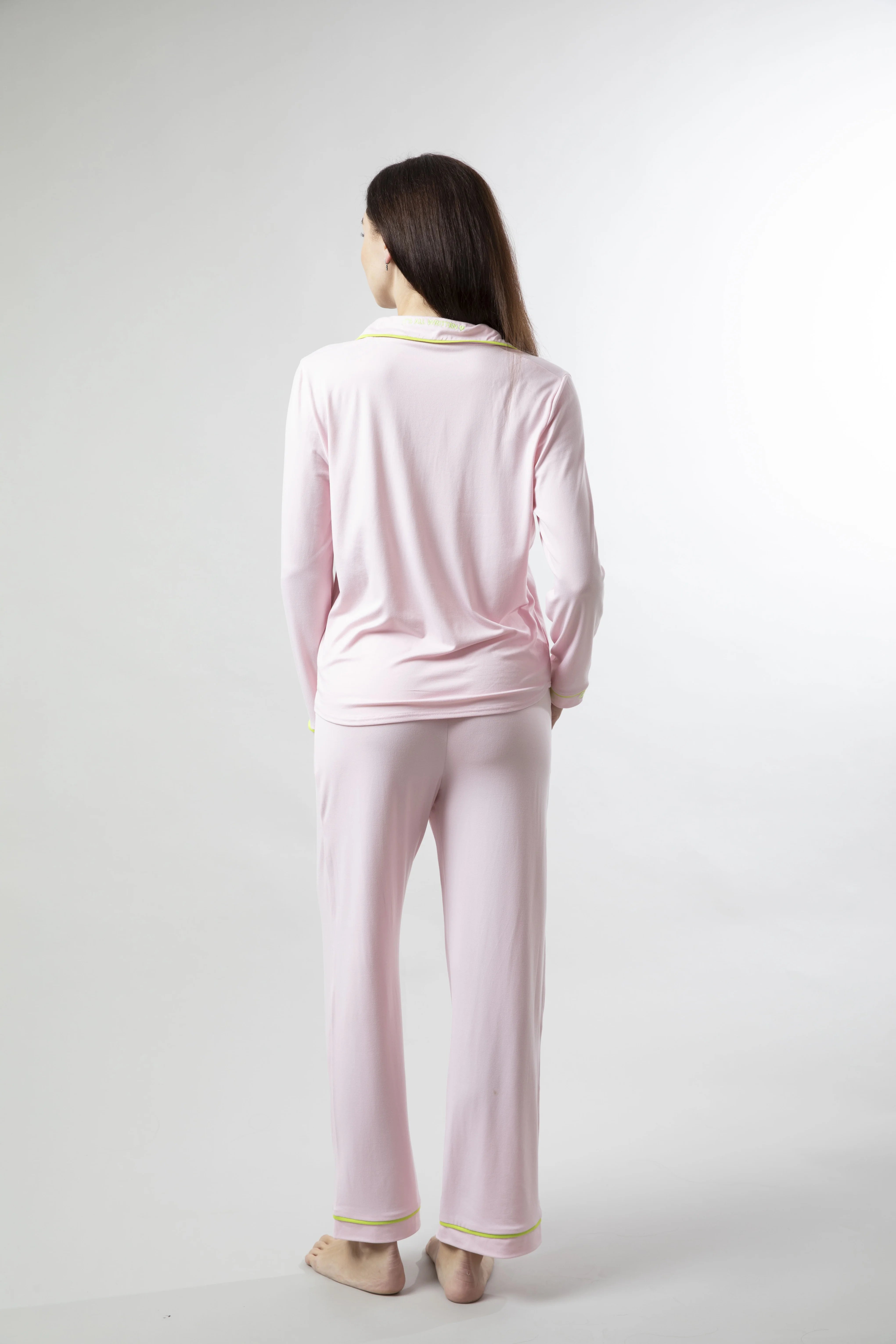 Baby pink PJ set outlined with pistachio piping, designed to feel soft, comfortable, and easy to wear. The soft feminine pink tone is calming and comforting, chosen to create a sense of ease the moment you put it on. Made for unhurried mornings, late conversations, and evenings that linger a little longer. A delicate heart embroidery at the cuff and "it's all written," our brand motto subtly detailed at the back of the collar.